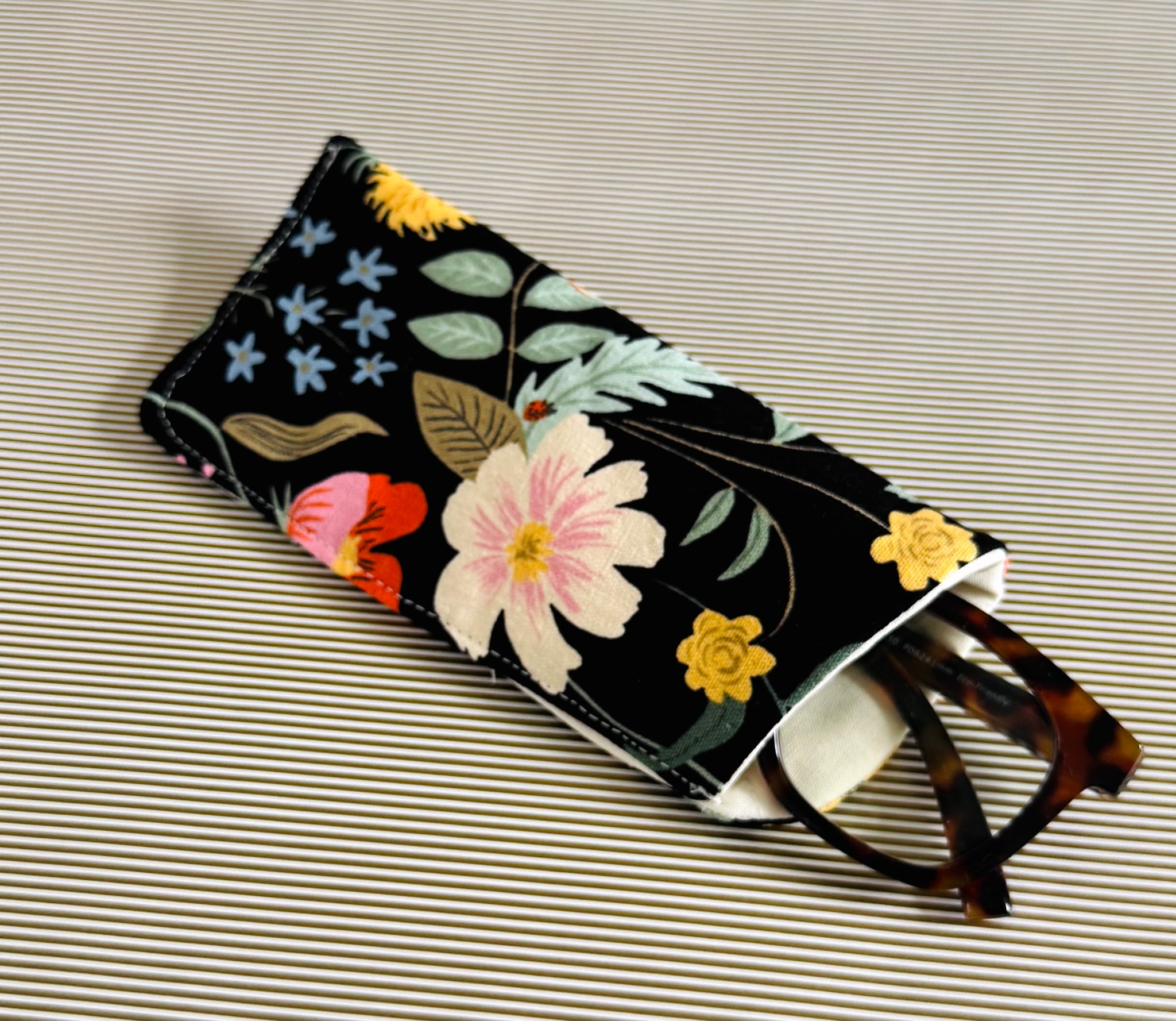 Black Strawberry Floral Padded Glasses Case – Linen Cotton Quilted Sleeve for Sunglasses & Reading Glasses | Stylish Protective Cover