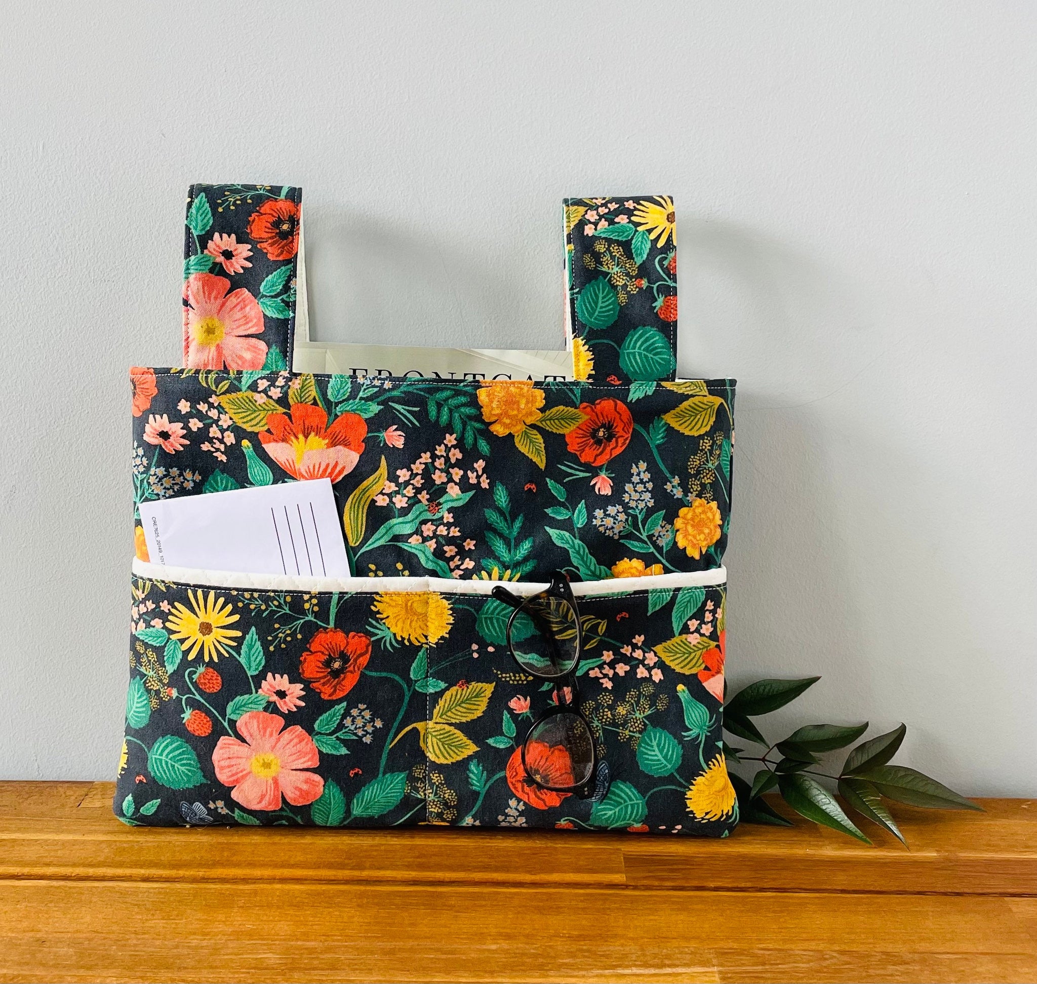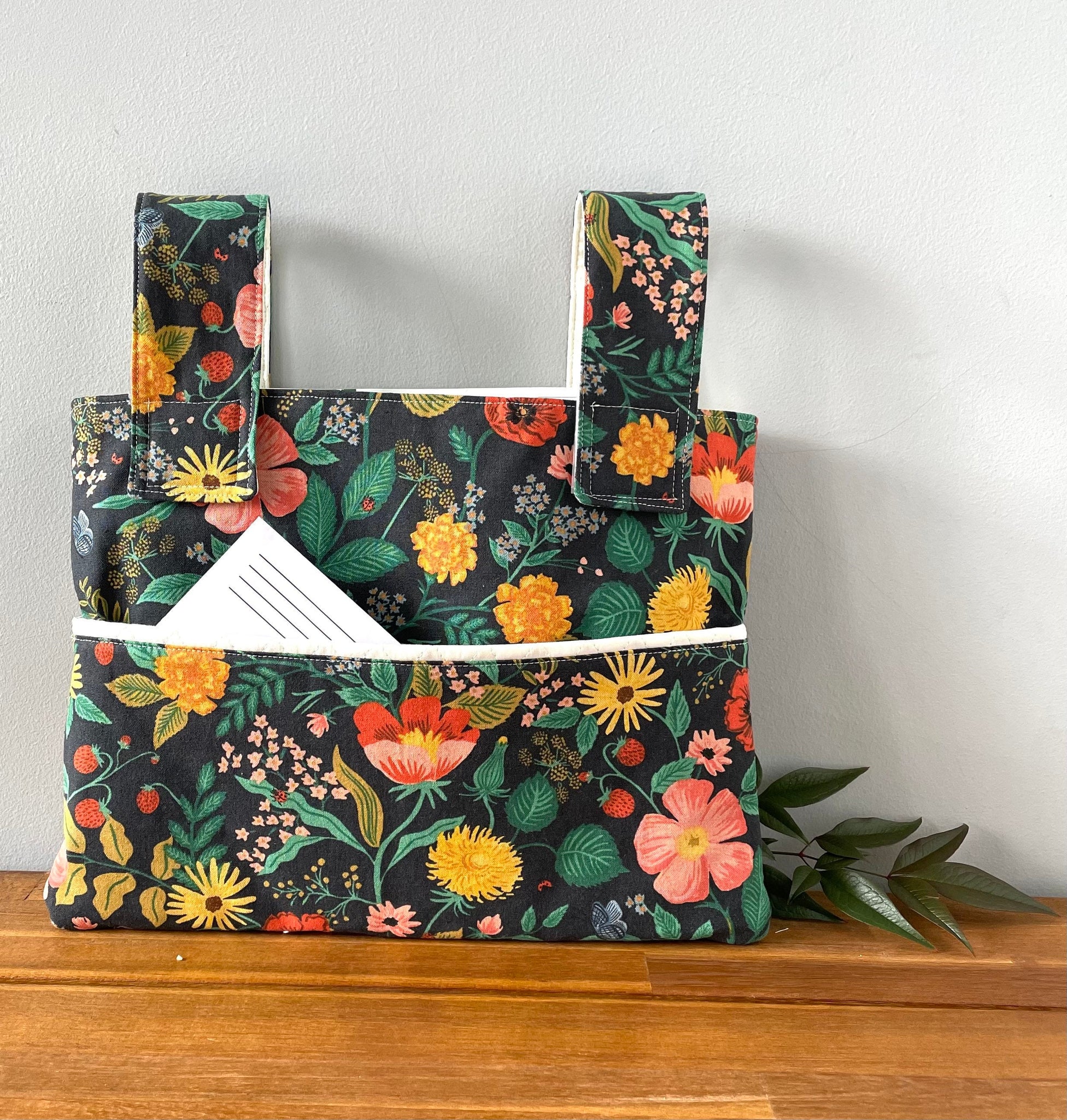 Got gear? At Grannys on The Go we believe that everyone is entitled to celebrate their style, be it young or old. Balancing a purse while using a walker can be more than a challenge, but who wants a boring, run of the mill, hum drum...(you get the picture) walker bag? You've got style! Why not show it by using a stylish, yet functional (occupational therapist designed and approved!!) "Grannys on The Go" walker bag? This bag is created using a Rifle Paper Co black "Camont" line home décor weight fabric, structured with a soft flexible interfacing and lined with coordinating cream quilted cotton fabric.